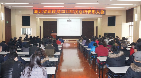 2013年1月18日上午,湖北省地震局召开了2012年度总结表彰大会,姚运生局长作总结报告,邢灿飞副局长宣读表彰决定,纪检组长黄社珍同志主持会议。