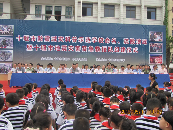 5月11日上午,由十堰市地震局和市教育局联合举行的全市防震减灾宣传主会场活动在十堰市实验小学举行。省地震局纪检组长黄社珍,十堰市政府副市长成佳刚出席活动。此次防震减灾宣传活动共组织市实验小学、市计算机技术学校、东风高级中学等11所学校2.5万多名师生参加了地震应急疏散演练活动,并授予11所学校 十堰市防震减灾科普示范学校称号。十堰市副市长成佳刚为新成立的十堰市地震灾害救援队授队旗,这标志着由消防、武警、卫生、地震和通讯部门人员组成的规模为70人的十堰市地震灾害紧急救援队正式成立。