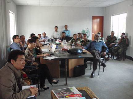 项目验收会上,程邈同志做了全英文汇报并回答提问。孟加拉军方代表戴维上校、顾问方、施工方及中工国际工程股份有限公司的负责人,对武汉地震工程研究院的工作表示满意。