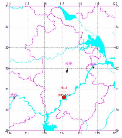 2011年01月19日12时07分,在安徽省安庆市与怀宁县交界(震中位于北纬30.6度,东经117.1度)发生M4.8级地震,地震震源深度9公里。该地震震中距我省省界距离约120公里,距武汉市约270公里。