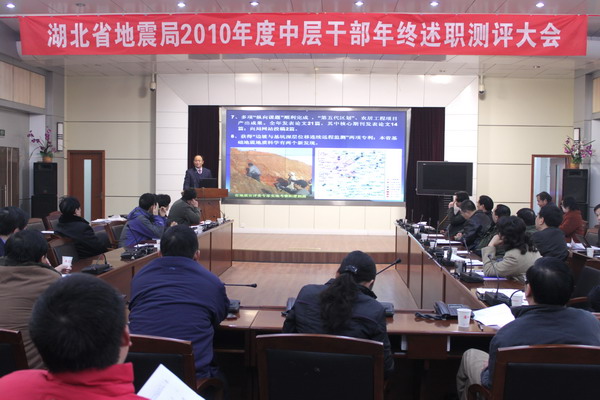 2010年12月28日,湖北省地震局召开了中层干部年终述职测评大会,局领导及全局中层干部共55人参加了大会。会议由刑灿飞副局长主持,参加考核述职的各部门主要负责人共22人,他们分别阐述了一年的工作成绩、工作体会、存在的问题,提出了下年度的工作计划。参会人员对述职干部进行了民主测评,并推荐了先进集体及机关文明处室。