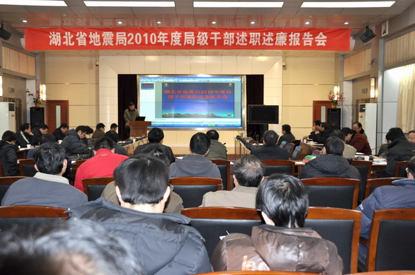 2011年1月5日,湖北省地震局召开了2010年度局级干部述职报告会,会议由姚运生局长主持,机关全体工作人员、下属事业单位负责人及副高职称以上科技人员共90多人参加了大会。