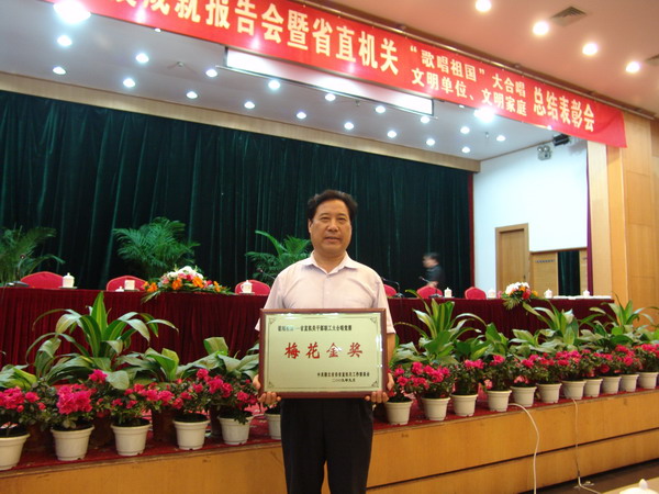 9月28日,湖北省直机关工委在湖北饭店举行总结表彰大会,对参加省直机关 歌唱祖国--省直机关干部职工大合唱竞赛100多个部办委厅局中表现优秀的单位进行了表彰,省地震局荣获梅花金奖。