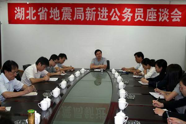 2009年9月18日至19日,湖北省地震局新进公务员座谈会在湖北省红安县举行。副局长邢灿飞,机关各处室负责人以及近年来新进公务员和青年职工参加了会议。本次会议结合了爱国主义教育和廉政教育,以参观、座谈的形式进行了生动的教育和深刻的交流。