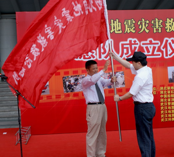 值5·12汶川特大地震一周年暨全国首个防灾减灾日到来之际,为了提高志愿者紧急救援技能,加强志愿者组织、统筹、协调能力,根据《中华人民共和国防震减灾法》和《中华人民共和国突发事件应对法》,湖北省地震局联合省红十字会、中国船舶重工集团公司710研究所,以及武汉警崴工贸有限公司、武汉消防器材厂等7家企业联合组建湖北省地震灾害紧急救援志愿者队。志愿者队伍成立仪式在武汉首义广场举行,省地震局姚运生局长为志愿者队伍授旗。