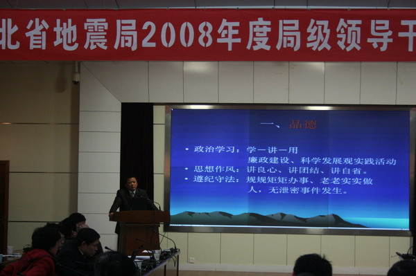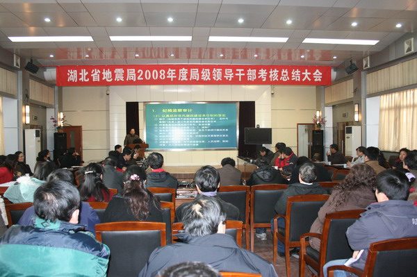 12月31日,湖北省地震局召开2008年度局级领导干部考核总结大会,会议由人事教育处处长主持,机关全体人员和下属事业单位负责人及副高以上人员参加了大会。
