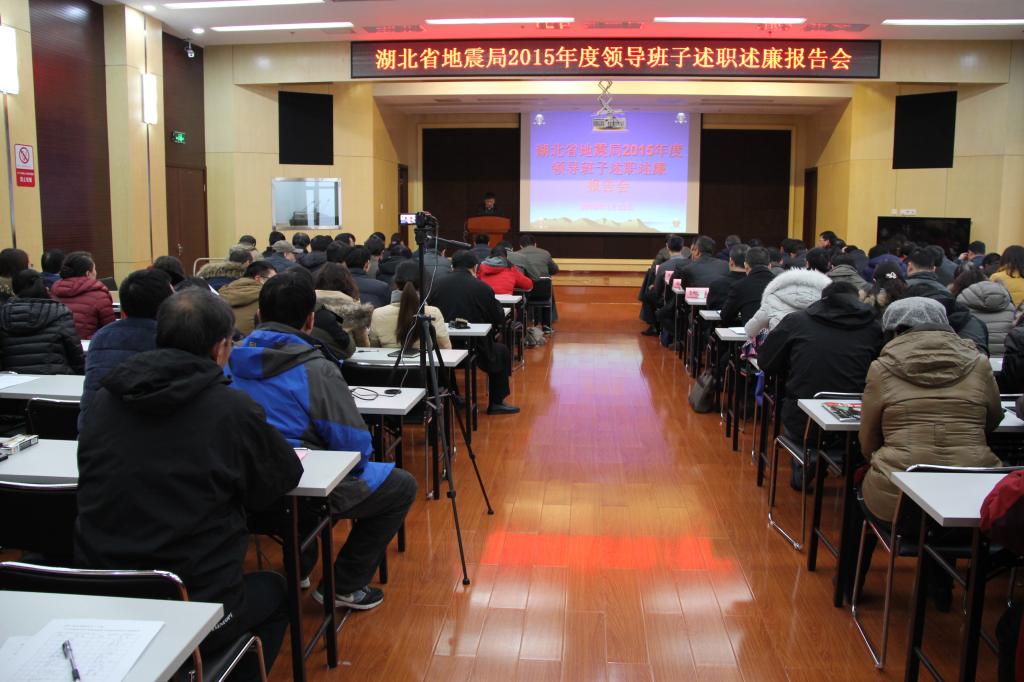 1月22日上午,湖北省地震局召开2015年度局级干部述职述廉报告会暨总结表彰大会。湖北省地震局领导班子全体成员、局下属各单位中层干部、副高职称以上科技人员、机关全体人员、各市州及部分县级地震局(办)主要负责人共100余人参加了会议。会议由湖北省地震局副局长吴云主持。