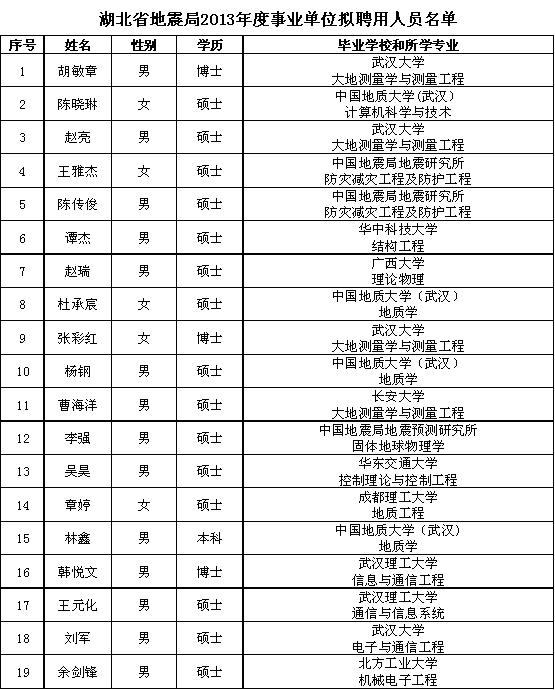 根据《事业单位公开招聘人员暂行规定》(人事部令第6号),经发布招聘公告、公开报名、资格审查、面试、体检、考核等工作程序,我局拟招聘胡敏章等19人为湖北省地震局事业单位工作人员,现予以公示。