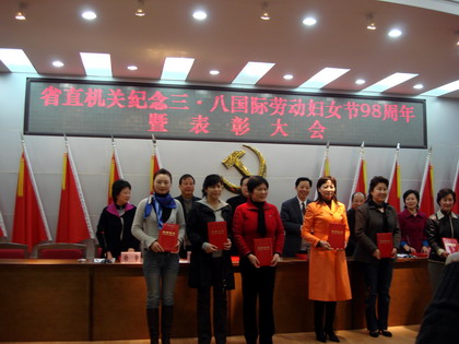 省直机关妇女工作委员会于2008年3月6日上午召开了省直机关纪念三八国际劳动妇女节98周年暨表彰大会,省直机关妇工委主任吴小玲主持了会议并宣读了《关于表彰省直机关先进妇委会组织、优秀妇女工作者的决定》,表彰了30个先进妇委会组织以及35名优秀妇女工作者。我局纪检监察审计处副处长、妇委会主任陈柏清同志获得了省直机关优秀妇女工作者称号。会议还总结了2007年的工作,布置了2008年的工作。