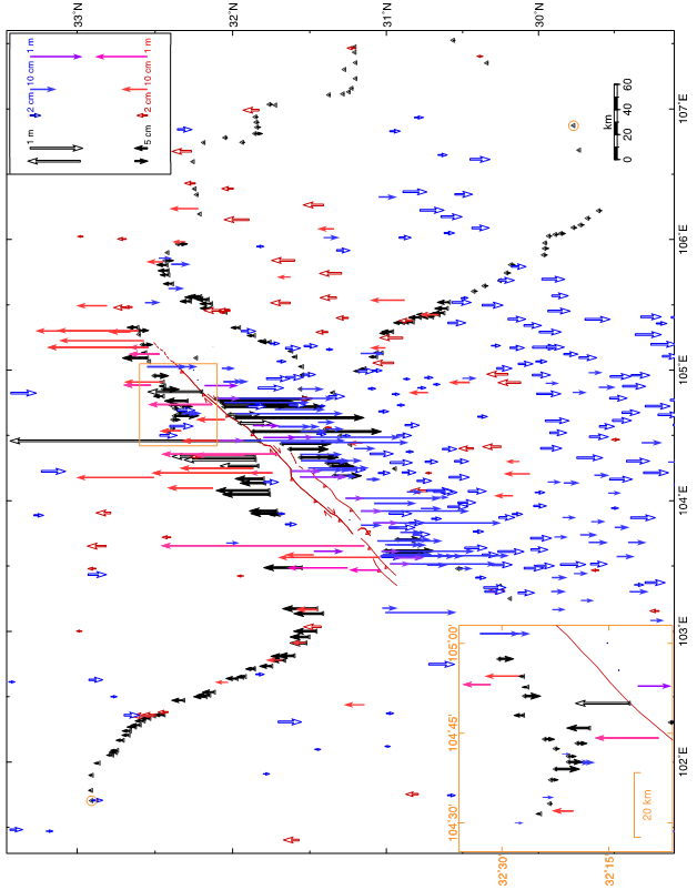 图以不同颜色,不同比例尺箭头显示同震水平位移(黑色和蓝色箭头)和震间位移场(红色箭头),红色实线代表发震断裂的地表破裂轨迹,蓝色实线代表活动断层,插图放大显示映秀,紫坪铺,郫县等地GPS位移。