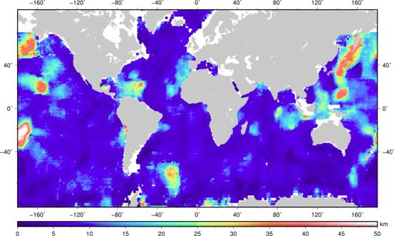 根据卫星测高重力异常反演海底地形模型的基础是岩石圈挠曲均衡理论。结合船测水深、全球海底地形模型和重力异常数据,我们进一步构建了1°×1°全球海洋岩石圈有效弹性厚度模型,如图2所示。结果显示,全球海洋岩石圈有效弹性厚度总体较小,10km以下区域约占70%,15km以下约占85.4%,均值和标准差分别为约10km和6.7km。岩石圈有效弹性厚度为20km以上的区域主要位于海沟外隆地区,洋中脊岩石圈有效弹性厚度一般小于5km;被动大陆边缘,如澳洲大陆南缘,岩石圈有效弹性厚度一般也较小;太平洋的海山密集分布地区,岩石圈有效弹性厚度一般为10-20km。