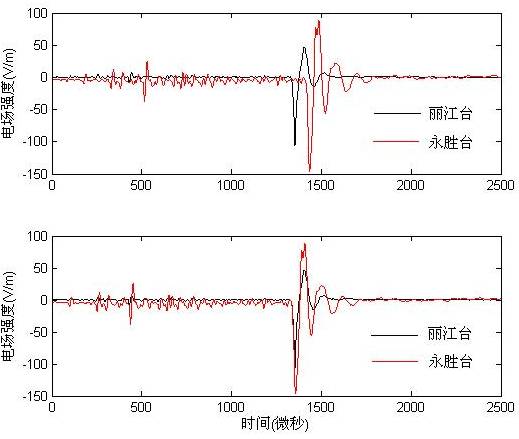 图4丽江台和永胜台同源信号记录(上:原始时序,下:永胜台数据前移约80微秒)