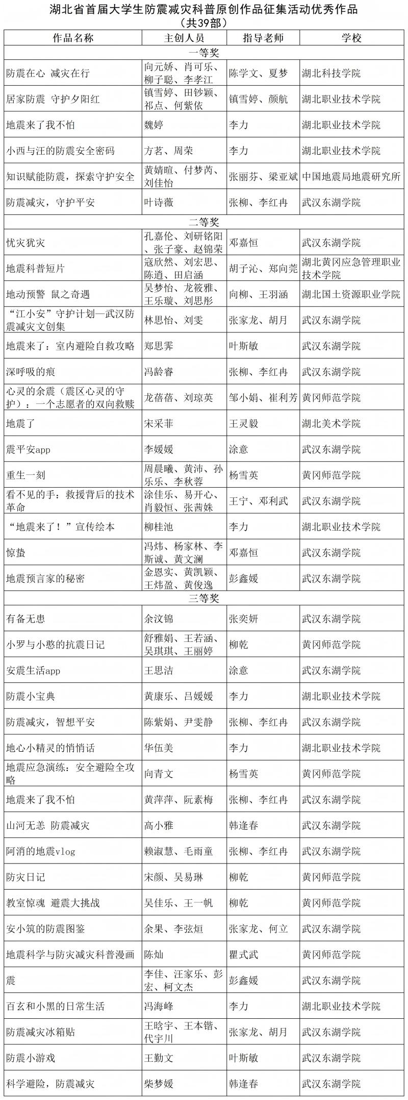 为深入贯彻落实习近平总书记关于防灾减灾救灾重要论述精神,提升大学生防震减灾素养与实践能力,推动科普创作传播,湖北省地震局联合省科学技术协会、省应急管理厅,共同举办了“湖北省首届大学生防震减灾科普原创作品征集活动”。经专家评审,评出优秀作品39部。现将评选结果进行公示,接受社会和广大网友监督。公示期间为2025年10月28日至11月1日,如对结果存有异议,请将有关意见于2025年11月1日前发送至hbfzxh@126.com。